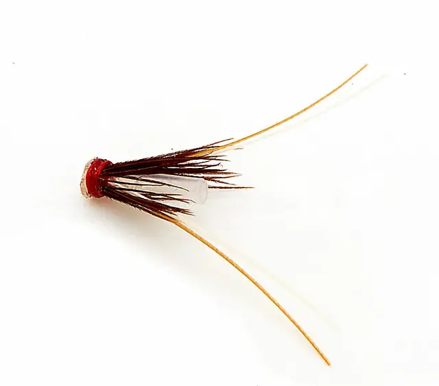 Denne er bundet på et ekstra tynn tube (1,1 millimeter), så ikke en tube som lett har plass til en krok inne i tuben. Et tips er å binde på kroken med en løkkeknute så kroken blir svevende bak flua, og hvis mulig trekker man knuten inn i tuben.