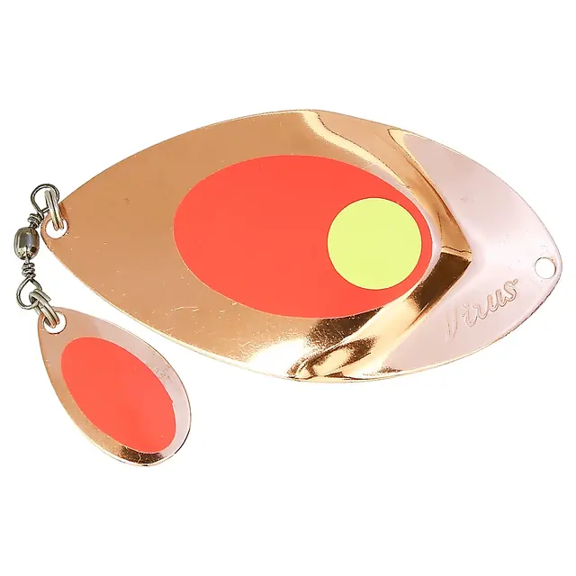 Velkjente Stor Virus røyeblink med en liten ekstraskje som lager lyd og ekstra attraksjon. Røyeblink for bruk på dypere vann eller under dårlige lysforhold. Leveres ferdig montert med Sufix fortom og VMC krok. 75mm.