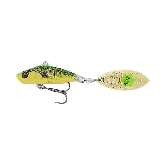 Spinnerskeden börjar rotera så fort beten träffar vattnet. SG 3D Stickleback Tailspin är mycket lättfiskad och ruggigt effektiv på abborre.
